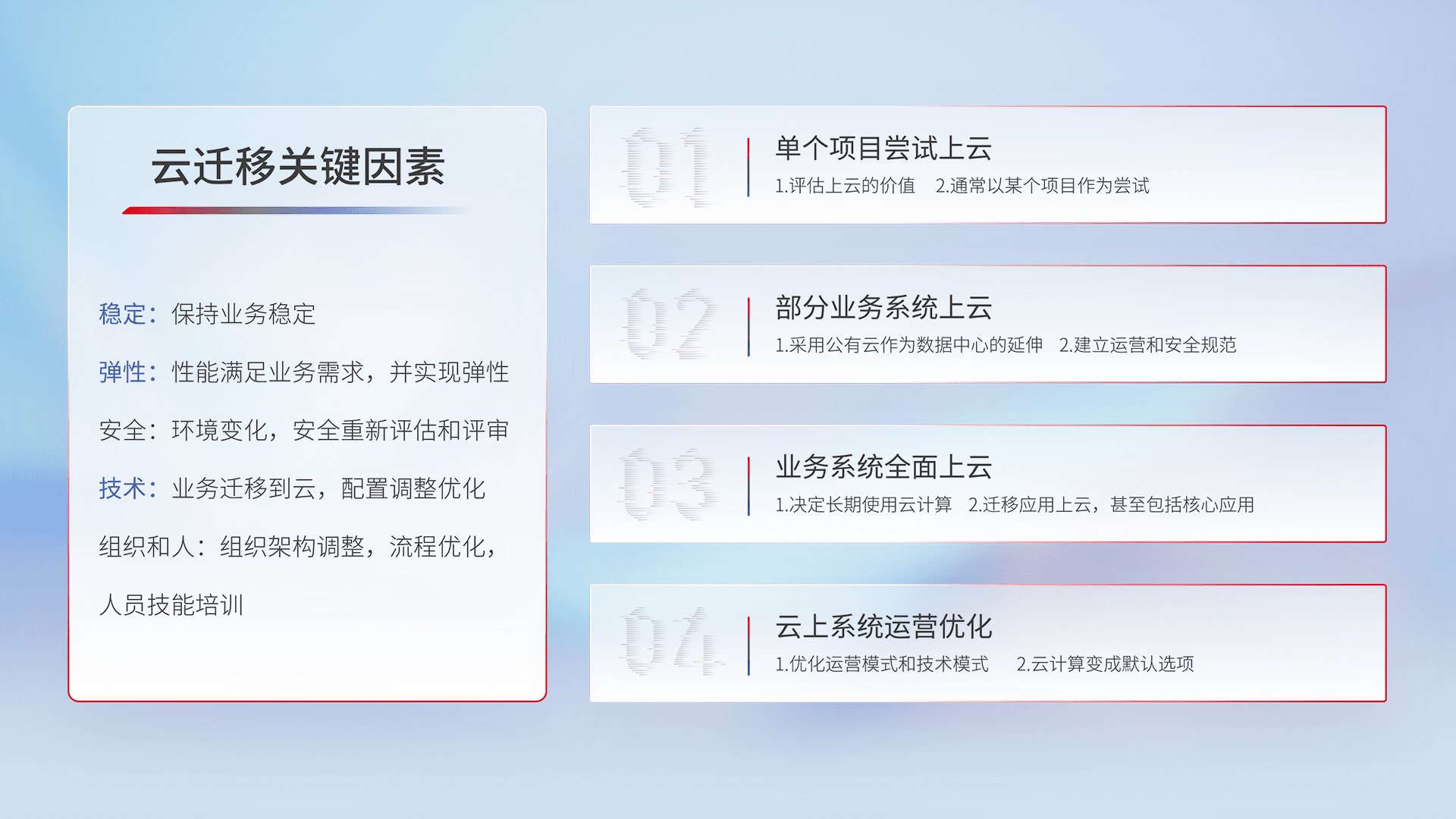 结合实际业务,,,,从规划设计、、云平台选型、、云原生改造、、数据迁移、、、集成交付,,迁移全过程为客户识别最佳上云路径,,,,做好风险识别管理,,,设计网络架构、、、身份权限、、、、安全审计合规、、操作审计、、、、日志审计、、监控告警策略、、多站点容灾设计等,,,,对云上基础设施进行整体规划,,,,提升IT治理水平,,,以满足弹性、、、、高可用、、高性能的需求。。。