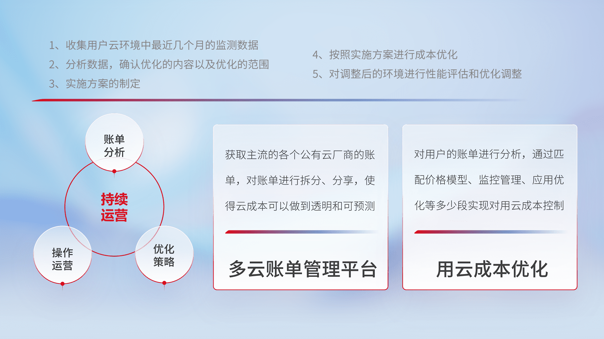 通过多云纳管,,以统一的资源数据模型把客户的云资源进行抽象和封装,,进而实现对多云资源的统一操作,,,保障云资源管理的可靠性、、、稳定性与可用性。。量身定制化运维内容,,,配置、、、、开发运维、、补丁管理、、、、备份、、、监控、、、、认证和访问管理、、审计和日常巡检等,,,,保障在用云过程中的可靠度,,,,稳定度以及高可用率。。